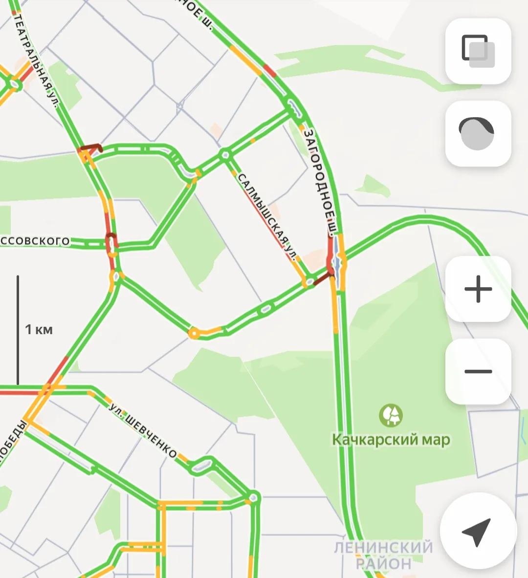 -Улица Терешковой: плотный поток от ул. Рыбаковской в сторону центра и заторы на пересечении с ул. Шевченко.