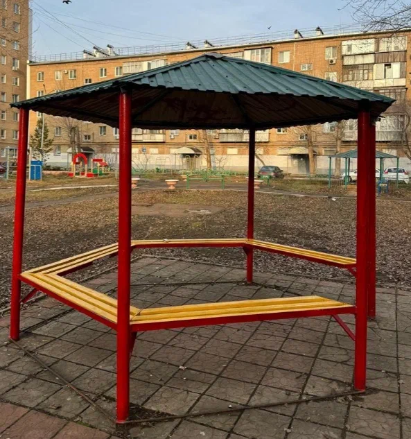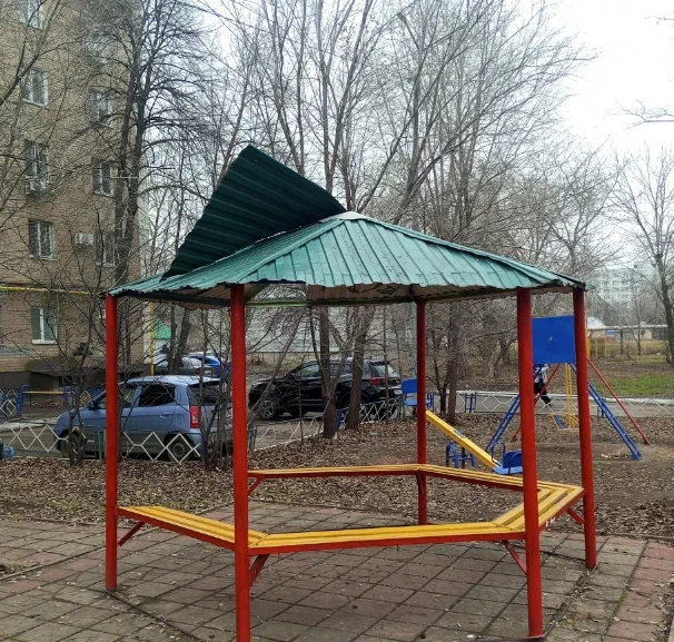 Так на улице Салмышская, 16/1 на детской беседке оторван кусок железной крыши. Работы выполнены.