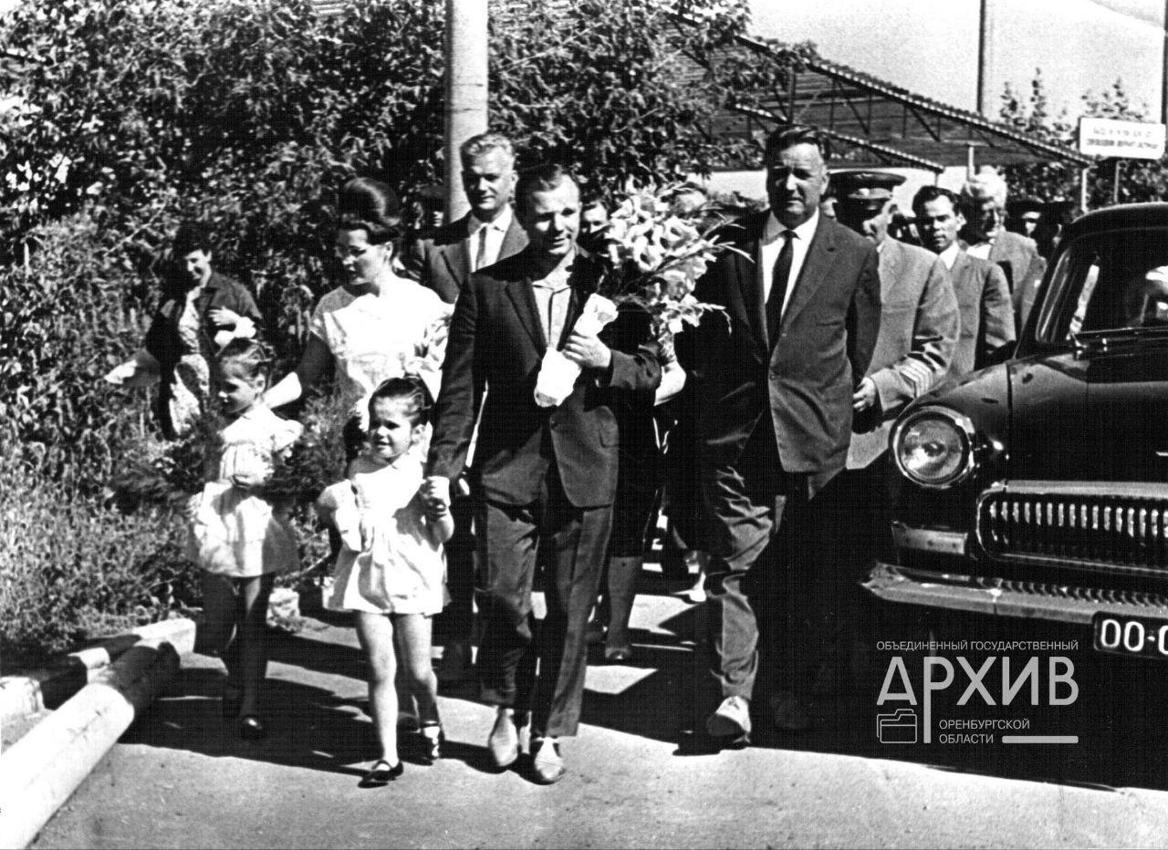 Фото Госархив — Юрий Гагарин с семьей в аэропорту Оренбурга, 1965 год — жена Валентина и дочки — Лена и Галя, сопровождают официальные лица области