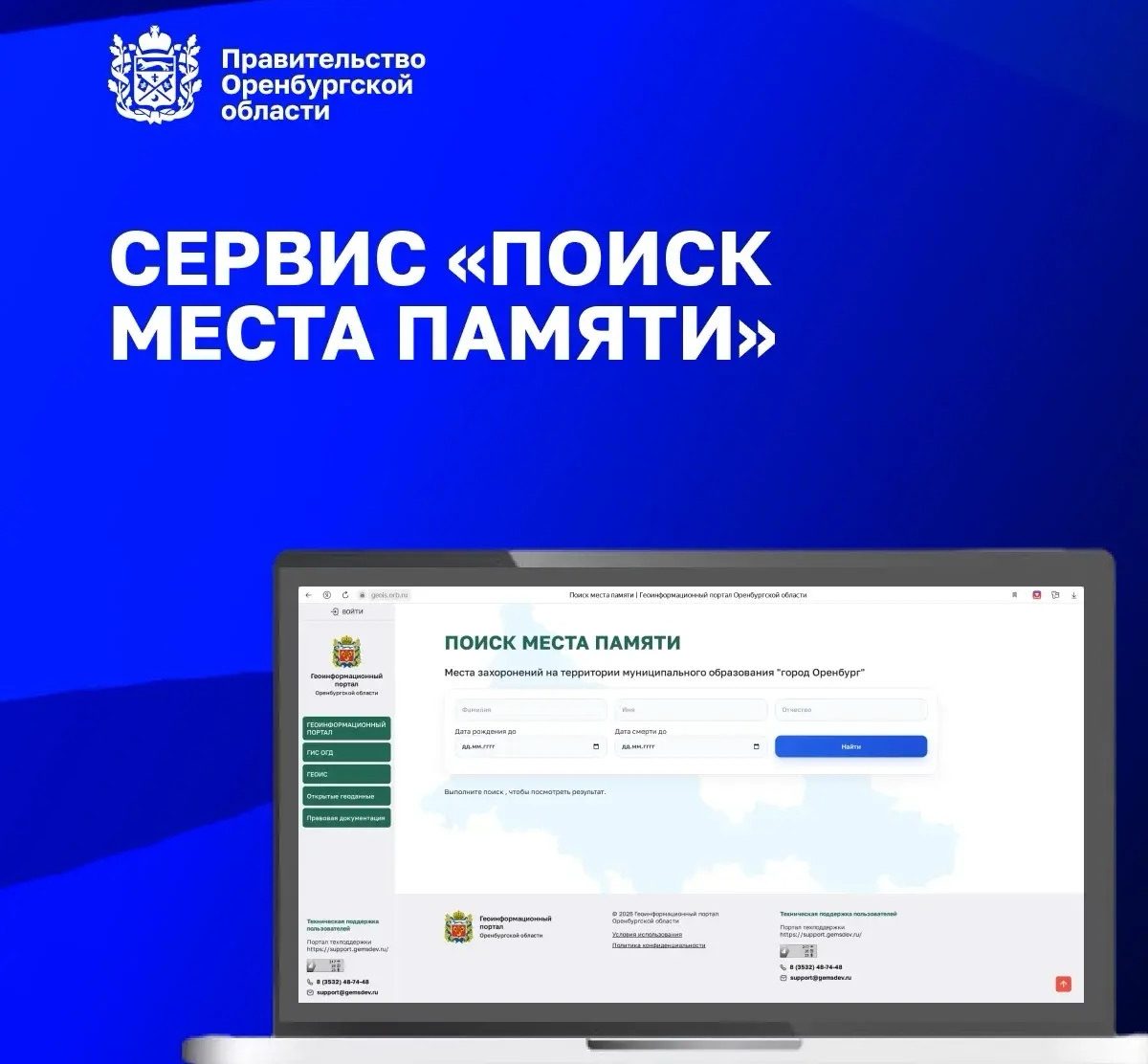 Сервис доступен на геоинформационном портале Оренбуржья. Для его использования необходимо выбрать баннер «Поиск места памяти» на главной странице портала. Далее, в специальном поле, следует ввести фамилию, имя и отчество усопшего, а также, по возможности, даты его рождения и смерти.